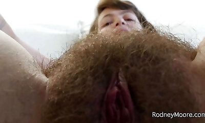 Climax craving wench is teasing her unshaved pussy in the bedroom