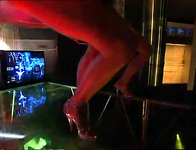 татуированная секретарша в высоких шпильках и чулках мигает подошвами
