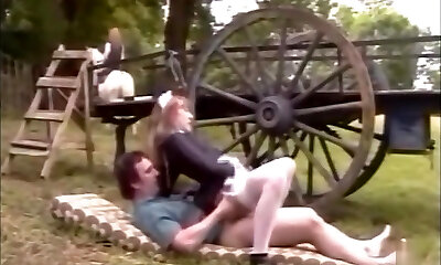 French maid in stockings fucks on a farm with huge money-shot