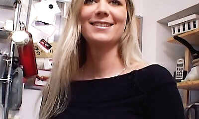 Horny blonde bimbo with shaved pussy blows big dick